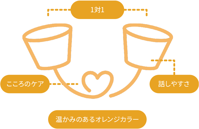 「こころの悩みや不安をいつでも気軽に相談してほしい」 そんな私たちの想いが込められた ⽷電話をモチーフにしたロゴマークです。 こころの専⾨家スタッフ プライバシーの確保 顔を⾒ながらの相談 相談時間は45分 スマホで気軽に 自分のお部屋などリラックスできる場所でゆっくりと 安⼼して話せる環境づくりにこだわります。